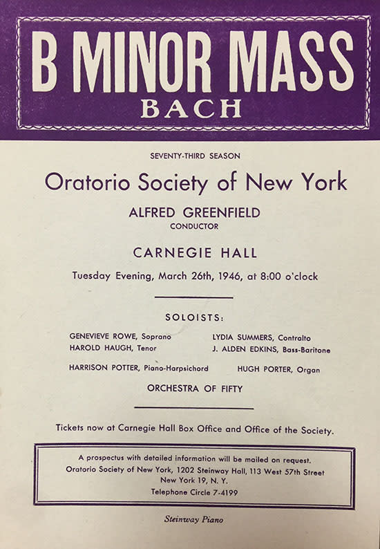 Flyer for the 1946 Bach B minor mass performance of the Oratorio Society of New York. Posted with permission from the Oratorio Society of New York.